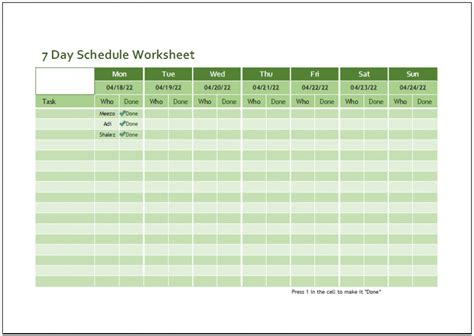 A 7 day schedule worksheet template is a valuable tool for managing your time, increasing productivity, and achieving a better work-life balance. By following the steps outlined in this guide, you can create a customized schedule that aligns with your priorities and helps you stay organized. Remember to review and update your schedule regularly to ensure it remains relevant and effective.