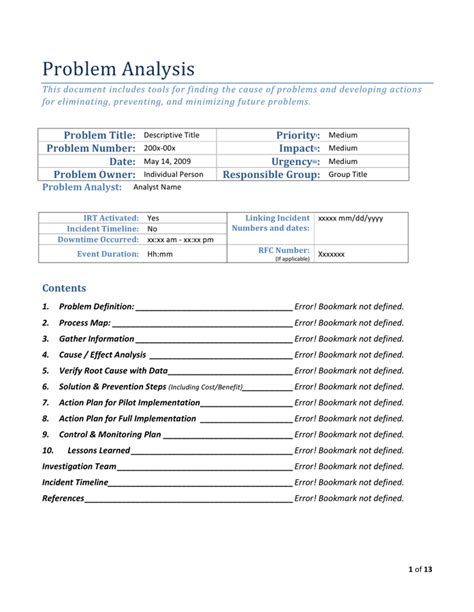 A problem analysis template is a valuable tool for anyone involved in problem-solving. By using a structured approach, you can thoroughly analyze problems, identify root causes, and develop effective solutions. The sample template provided in this article can serve as a starting point for your own problem analysis. Remember to customize it based on your specific needs and regularly review and update it as necessary. With proper analysis and effective problem-solving techniques, you can overcome any challenge that comes your way.