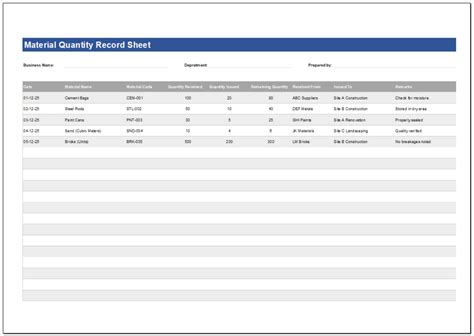 - Inventory Management: Material quantity record sheets provide valuable insights into the inventory levels of different materials. This helps in determining when to reorder materials, avoiding shortages or excess stock.